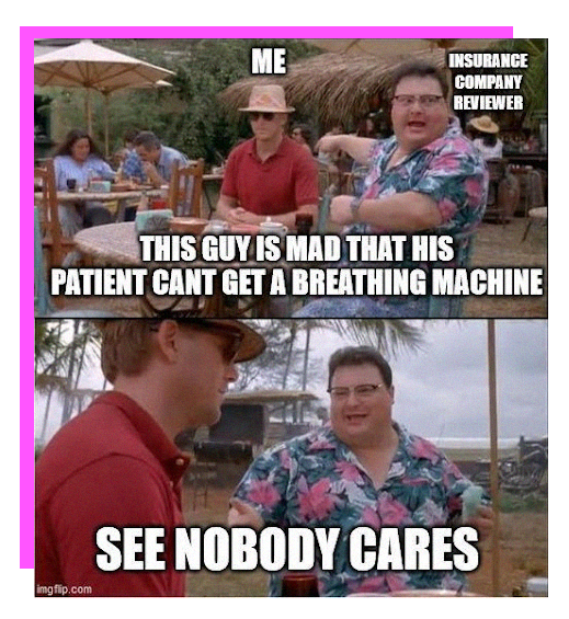 I recently had a patient who had severe obstructive sleep apnea (stopping breathing to the point of frequent severe hypoxemia) that required >40 office communications to get the insurance company to “authorize” a machine that was necessary (assuming oxygen is necessary) to stabilize the airway. I personally spoke to the insurance company on the phone twice totaling more than 1 hour of my time. The “physician peer reviewer” told me: “Yeah, you are right, but I still can’t authorize treatment because of X red tape.” (If you knew what the specific red tape issue was, the whole thing would seem even dumber).