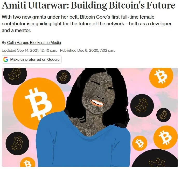 A Decrypt profile followed in December 2020, under the headline 'Amiti Uttarwar Is Blazing A Trail For Inclusive Bitcoin Development', the same week Zhao was announced as Brink's first fellow. CoinDesk named Uttarwar to its Most Influential list in December, also the same month.