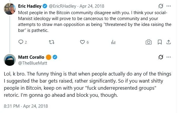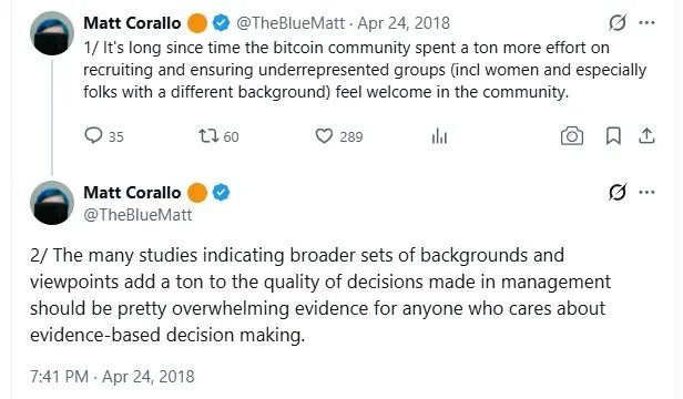 In April 2018, a year before Uttarwar met Newbery, two years before Zhao did, Corallo posted a thread on Twitter explicitly calling for Bitcoin community outreach to underrepresented groups. "It's long since time the bitcoin community spent a ton more effort on recruiting and ensuring underrepresented groups (incl women and especially folks with a different background) feel welcome in the community," he wrote.
