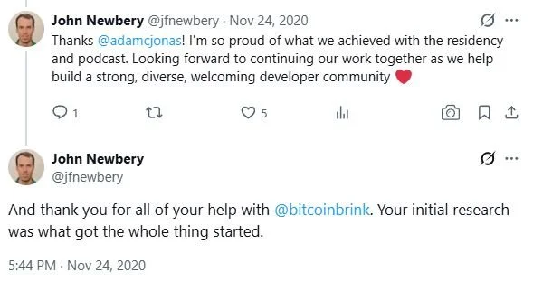 On launch day, Newbery told Jonas publicly on X: "Your initial research was what got the whole thing started." That acknowledgment, made to Jonas directly, on November 24, 2020, is the only on-record confirmation of Jonas's founding role. It does not appear in any Brink public materials, its IRS filings, or its launch press coverage.