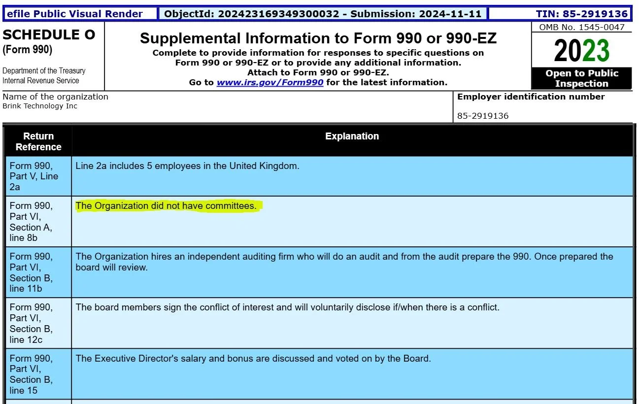 Brink's own IRS filings shows no existence of a grant committee. Schedule O of the Form 990 explicitly states "The Organization did not have committees", not once, but in every single filing from FY2020 through FY2023, the entire span across which Schmidt was publicly citing the committee as a governance safeguard.