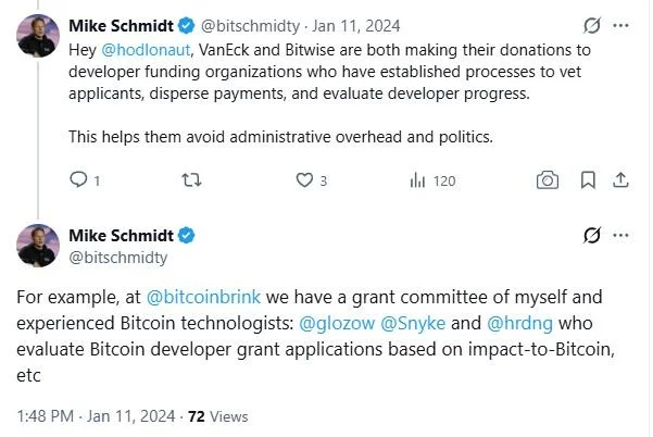 Brink has publicly described its engineer selection as governed by a "separate grant committee with independent members." Schmidt cited this committee repeatedly on the public record: in April 2023, defending Brink against charges of centralised control; in June 2023, describing the committee and board as joint authorities over fund usage; and in January 2024 — answering a direct question about who decides which developers get funded — naming four committee members: himself, Gloria Zhao, Christian Decker, and David Harding.