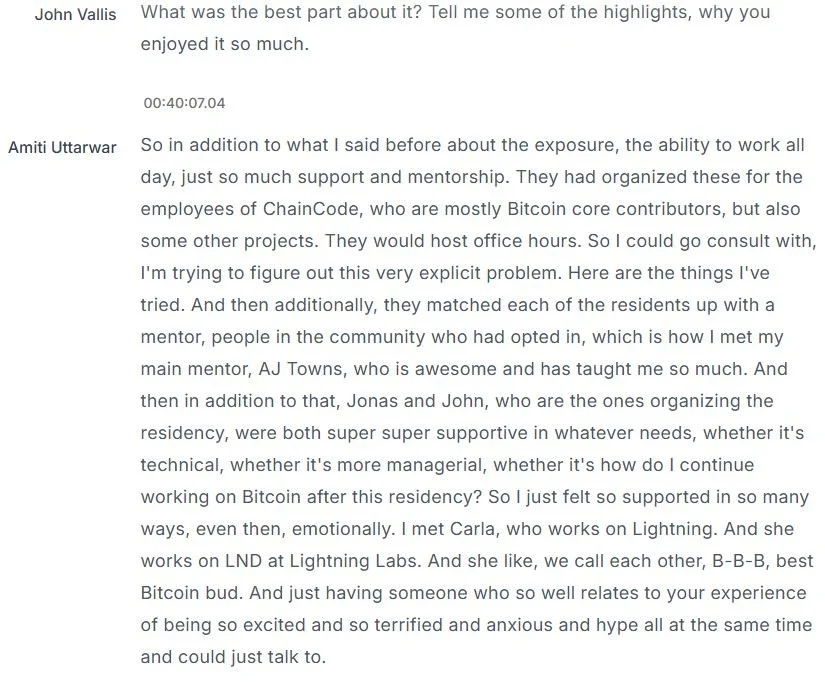 “I met with Amiti Uttarwar and John Newbery on a very fateful day and they’re not what I imagined. And you know, John, he says in his very soft, British voice, he goes, Oh, I work on Bitcoin Core, the most interesting project in the world..[….] And I basically sit there for three hours and they very kindly let me pick their brains.”